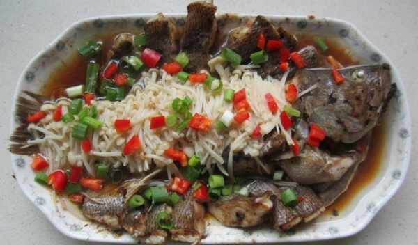 豆豉蒸鱸魚:鱸魚去內臟洗凈切2片花刀,用鹽、壓碎的豆豉、料酒、蔥薑蒜、雞精醃漬20分鐘,鱸魚擺盤淋上食用油大火蒸10分鐘,撒上蔥花和碎紅辣椒即可,魚肉十分的鮮美,還很開胃。