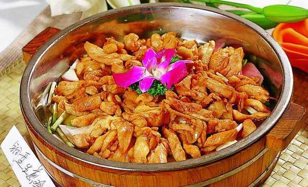 生煎雞:將凈雞斜刀切成厚 5毫米的橢圓片。炒鍋置中火,註入豬油旋鍋,使油佈滿鍋底,形成油膜;將鹽均勻地撒在鍋中,放入雞片,煎至兩面金黃熟透,出鍋裝盤,盤邊放少許花椒鹽,即可上桌。看到就想吃一口。