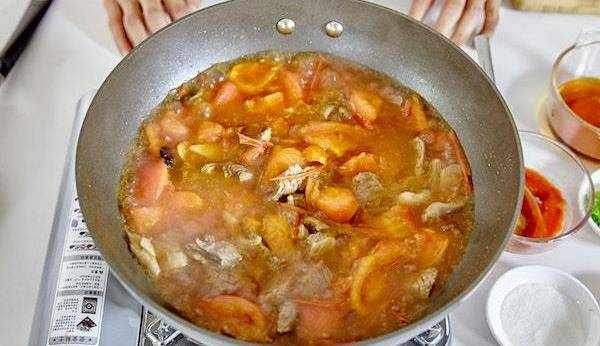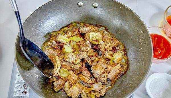 13. 倒入剛才燉好的牛肉和湯,向鍋中加入鹽一勺,糖兩勺。