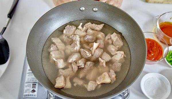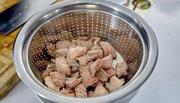 4. 鍋中燒開水,把牛肉下鍋焯水,可以去血漬和些許膻味。