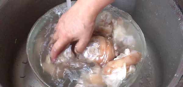 步驟4:將汆燙好的豬腳移到水槽水龍頭下,以流動清水對豬腳持續清洗。