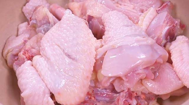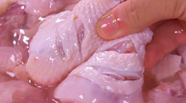 菜市場裡面買回來的雞肉把其先清洗一下,再把雞肉切成小塊,切好的雞肉放入盆中,再放入一勺食用油和一勺淀粉,最後倒入清水把雞肉清洗幹凈,清洗好後撈出重新倒入清水再清洗一遍