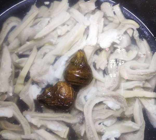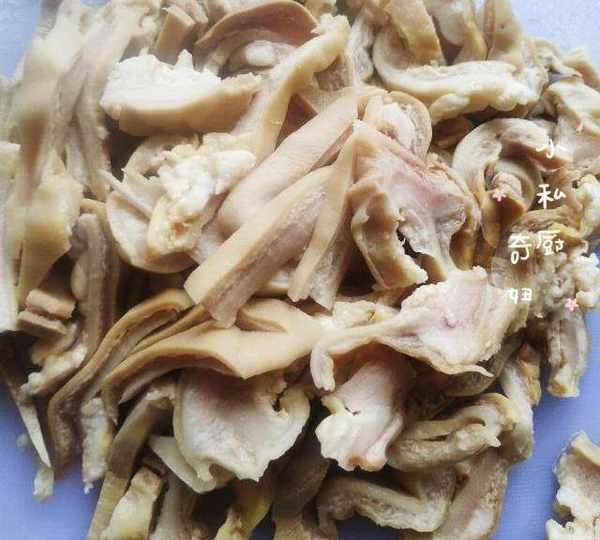 3.將洗幹凈的豬肚,冷水下鍋,煮斷生即可撈起,切厚度適中的薄片即可。