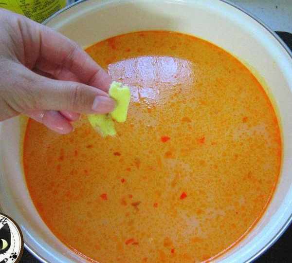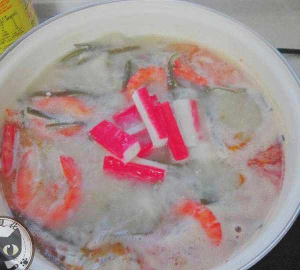 第7步、最後放入蟹柳,調入少許鹽、味精和食用油,煮開後熄火即可。