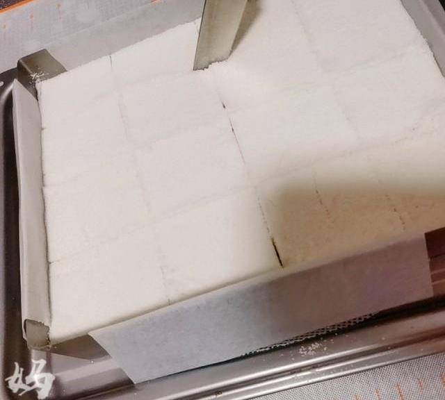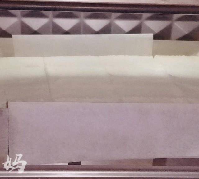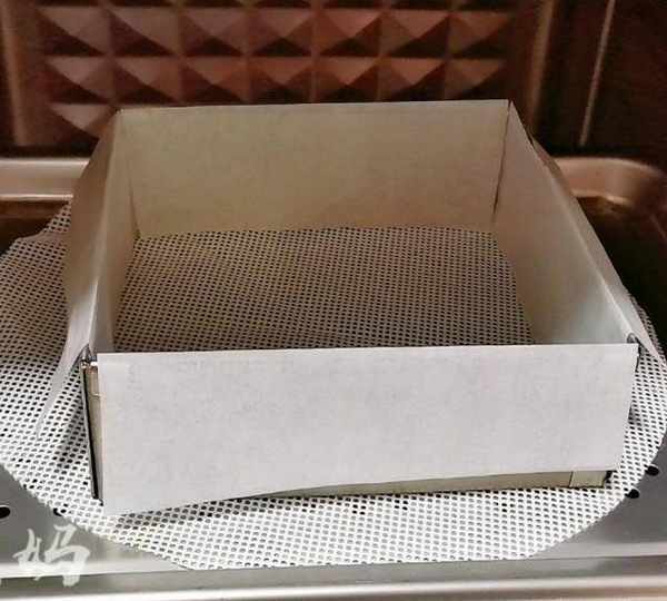 第10步、提前準備好模具,我用的是方形慕斯圈,四周貼上矽油紙,這樣為瞭好脫模。