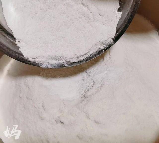 第4步、然後倒進提前混合好的大米粉和糯米粉中,慢慢攪拌一下。