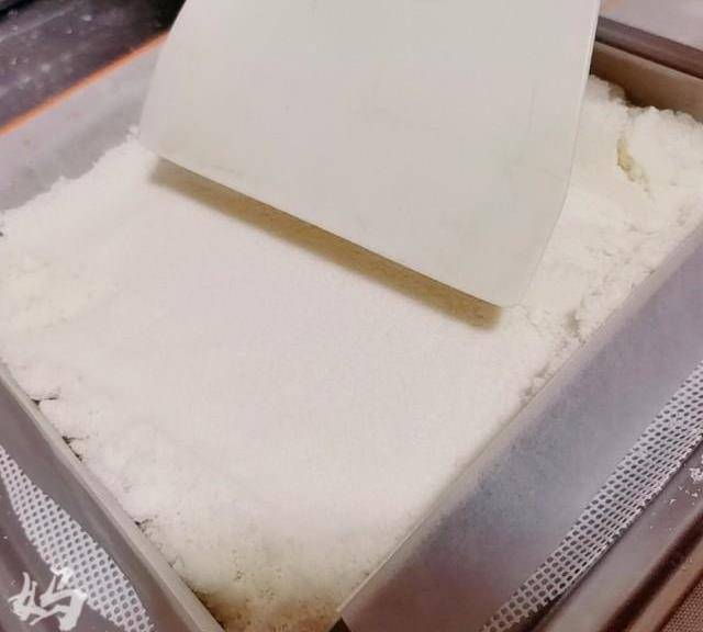 第11步、過濾好的粉狀食材,直接倒進模具裡,用刮板刮平。