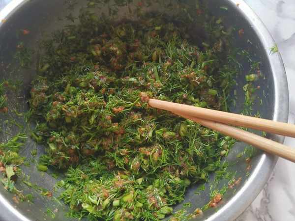 第三步:茴香苗清洗乾淨備用。茴香苗營養豐富,是茴香的嫩苗,含維他命、胡蘿蔔素、鈣、鐵等營養物質,並含有茴香油,可以健胃行氣、促進消化。而且茴香苗還有一定的祛濕,止痛和抗菌等作用,是很不錯的一種蔬菜。清香的味道很喜歡,做餡包餃子蒸包子都很棒。