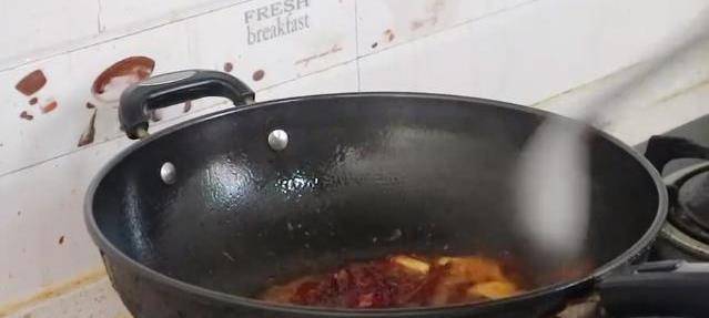第二步:起鍋燒油,油熱之後,首先把準備好的花椒和大料放入油中,輕攪兩下,再放入幹辣椒、蒜海還有大蔥,加入適量的豆瓣醬,清炒之後,放入豆乳醬,再倒入適量的番茄醬。