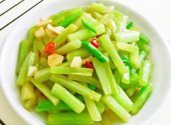 嫩萵筍適量、大蒜頭適量、米椒適量、蒜苗適量、油適量、雞精適量、蠔油適量。