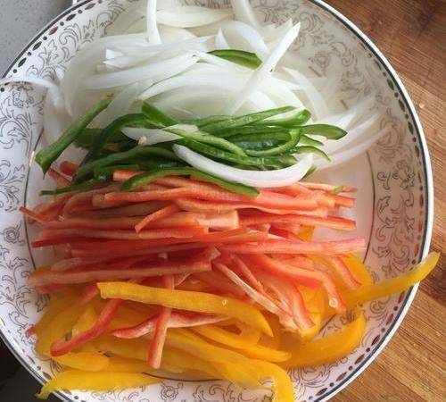 3、將洋蔥,青椒,紅椒,切絲備用