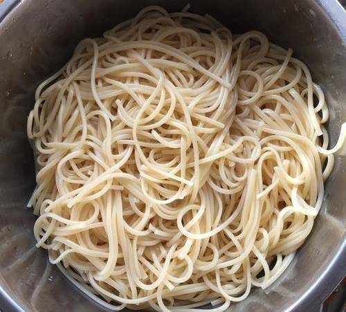 2、煮熟後,取出沖水,撈出控幹水分,加入兩湯匙油拌勻