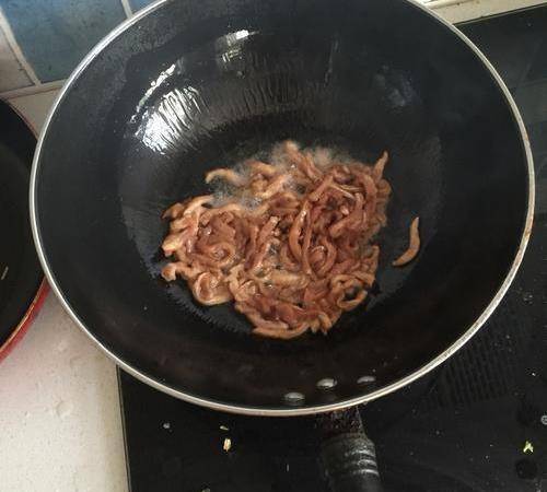 5、鍋燒熱放油少許,把牛肉放入鍋中迅速翻炒至8分熟,