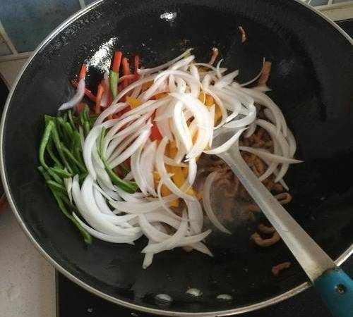6、鍋中加入洋蔥絲,青紅椒絲翻炒均勻,