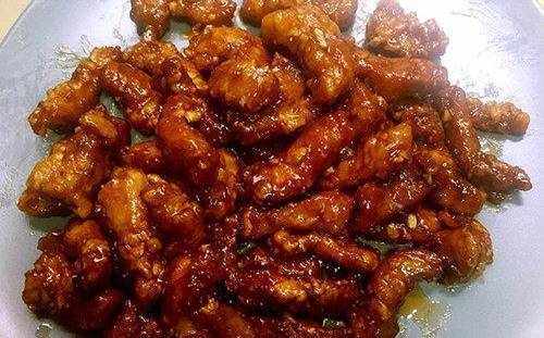 糖醋裡脊,這道菜是一位南方同學燒的,當時他特別囑咐我買嫩一點的裡脊肉,然後用生粉裹上,然後放油鍋裡炸,最後用醋和白糖等調制的料炒過後,油亮金黃、酸甜可口、外酥裡嫩的糖醋裡脊就出鍋瞭。這道菜十分受外國人喜歡啊,看他快吃瞭一盤瞭,外國洋人本來就是喜歡吃偏甜一些的食物,這盤糖醋裡脊太讓他喜歡瞭,他一直一邊吃一邊誇“Delicious”!