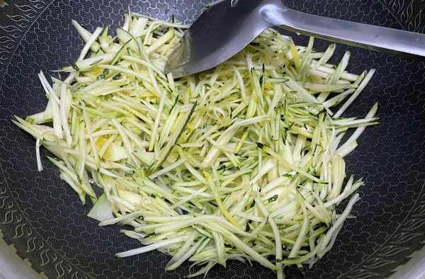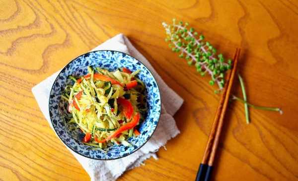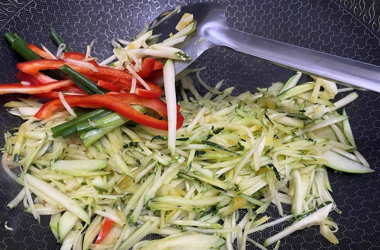 1. 嫩南瓜清洗幹凈切絲,也可以用刨絲刀刨絲,看你哪個方便,彩椒和香蔥切絲,備用。