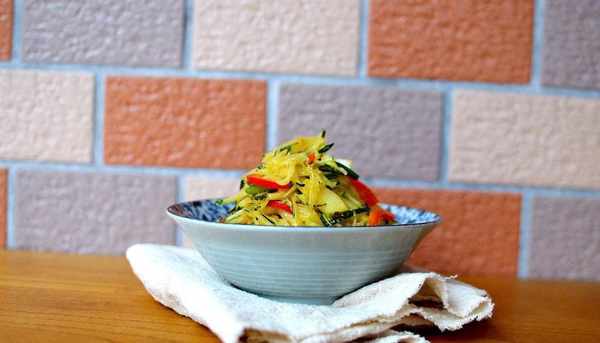 這個菜品酸辣可口,非常開胃下飯,而且熱量非常低,也推薦給夏季胃口欠佳的人。咸蛋黃醬包裹著南瓜絲,醇香酸辣的蛋黃味直達味蕾,入口即化,而迎接的是多汁爽脆的南瓜絲,清新鮮甜,消食減脂有這個菜,真不是吃素的,哈哈