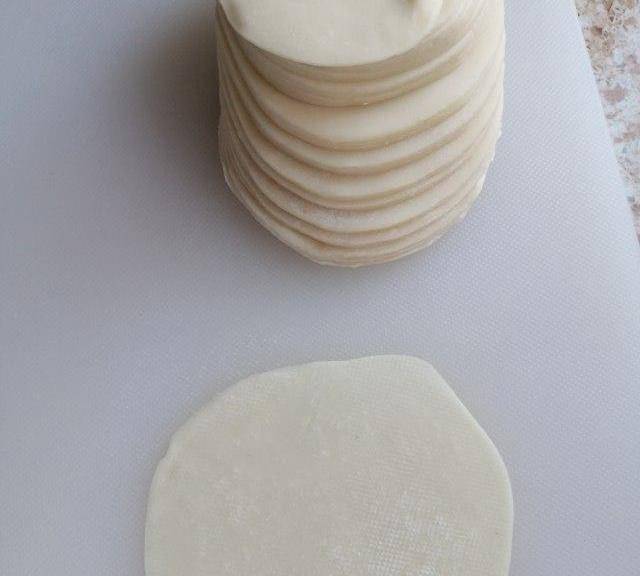 第7步、買現成的餃子皮在搟大一圈這樣好包。