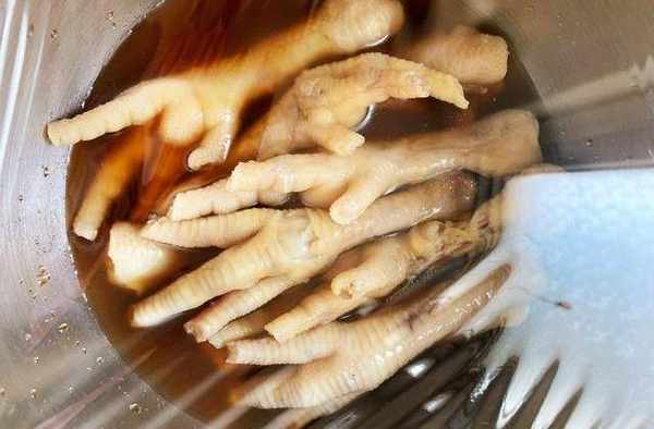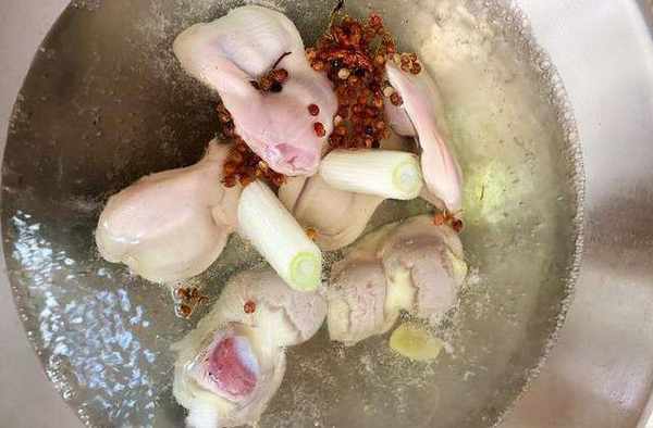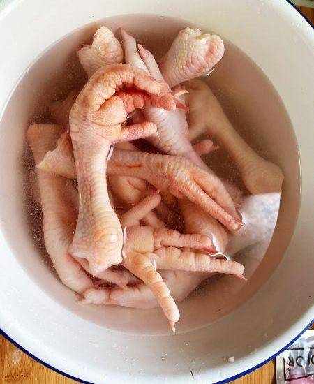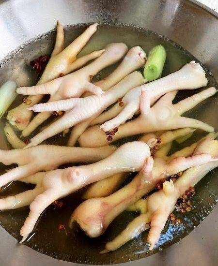 13、燒一鍋水,水開後放入準備好的香料,再倒入雞爪,煮30分鐘(覺得沒煮軟爛可以增加時間),煮好後撈出過涼水