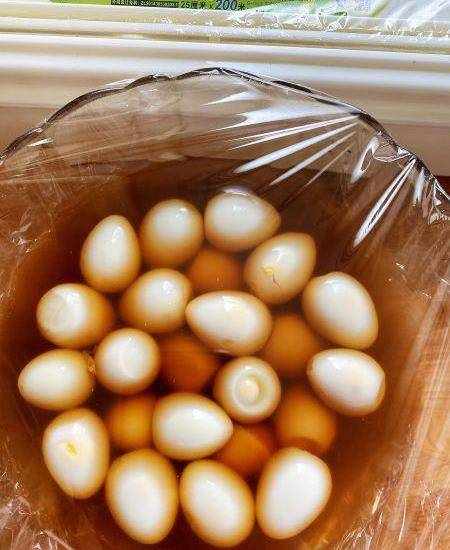 3、鵪鶉蛋放入容器,倒入糟鹵(沒過食材就行),蓋上保鮮膜,冰箱冷藏醃制1-2小時
