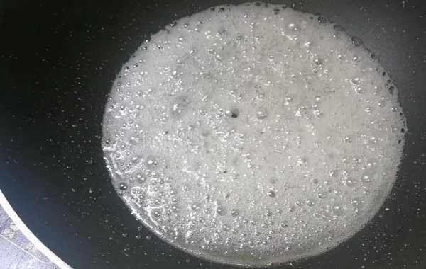 第六步:糖汁會逐漸的變成大泡,最後開始轉小泡,把糖熬成下圖中這種密集小泡,關火。