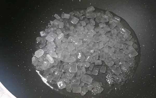 第8步:隨著不停的攪拌,溫度逐漸降下來,糖會慢慢的結沙,繼續炒,直至糖變成固體狀。