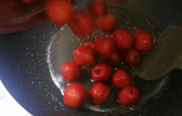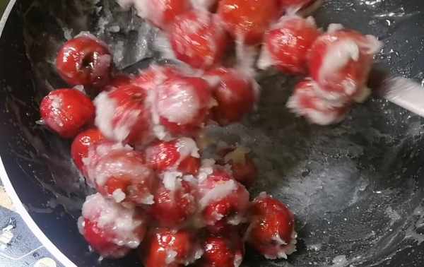 第七步:關火2分鐘左右,糖稍微冷卻下來,我們下入山楂,不停炒拌,糖太熱的話,山楂容易破皮。