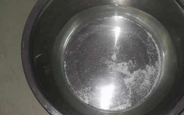 第一步:盆中加入適量清水,放入稍多一點的鹽,攪拌一下讓鹽融化。