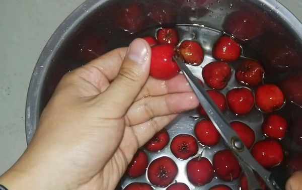 第三步:用剪刀把山楂的蒂剪掉,山楂的蒂是容易有殘留臟物的地方。