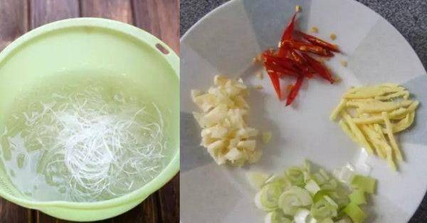 1、食材準備:香菇、蝦、粉絲、紅辣椒、蔥、薑、蒜、鹽、醬油、油、白酒各適量;