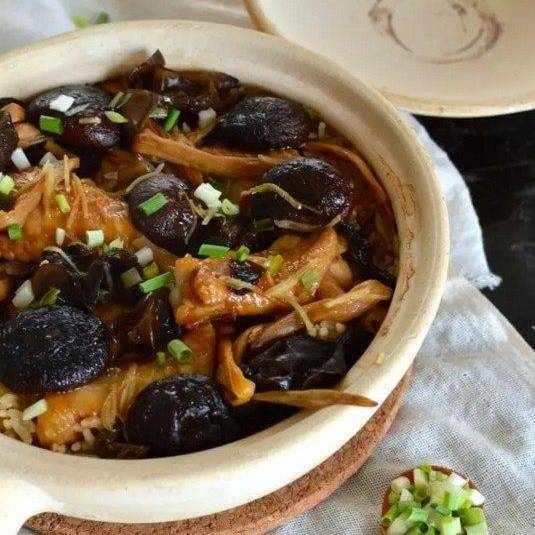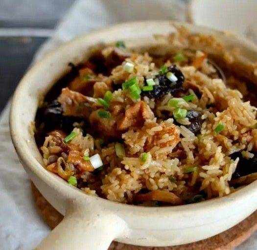 4、在煲仔中加入白米和清水,再加入雞肉、香菇、木耳、金針菜;