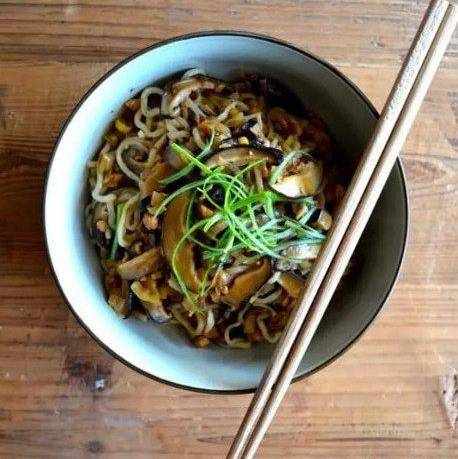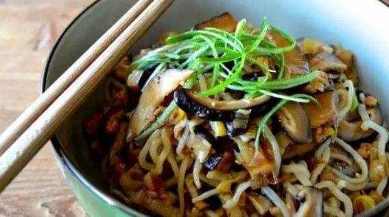 4、熱鍋入油,加入豬肉炒3-4分鐘,加入蔥、香菇和醬油,繼續炒5分鐘,最後加入面條炒2-3分鐘即可。