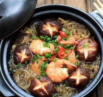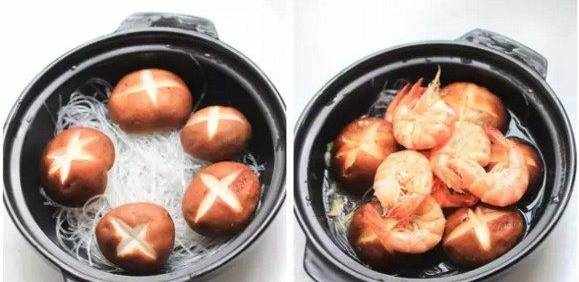 5、在鍋中先放入粉絲,再將蝦和香菇放在上面,加入放油鹽、醬油、料酒和清水的汁料,最後加熱5分鐘,撒上蔥花和辣椒就可以吃啦。