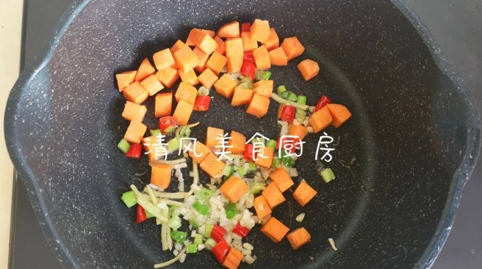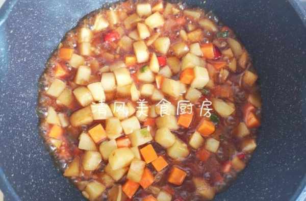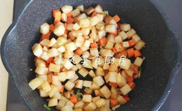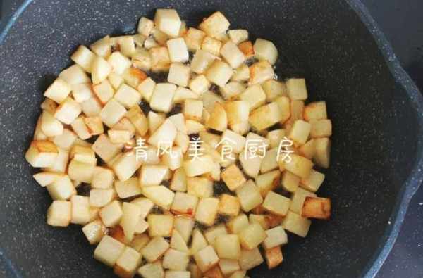 鍋燒熱,加稍多的油,放入土豆丁,中火,油不用太多,基本上就是半煎半炸的樣子,至土豆表面微微有點焦的狀態,盛出來。