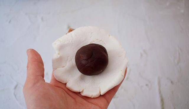 4、糯米面團平均分成6份,取一份面團揉圓壓扁,放入豆沙餡,再利用虎口慢慢收口,然後收口捏緊