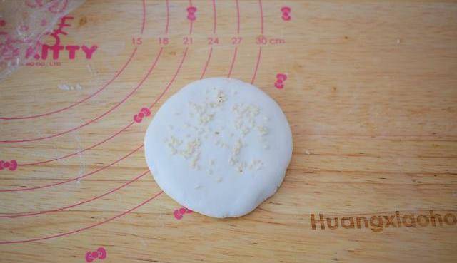5、然後用雙手揉圓放在案板上,輕輕按壓成餅狀,表面再撒上白芝麻,再輕輕按壓使之服貼