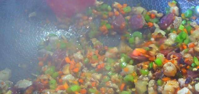 10.最後倒入蒸好的糯米飯,關掉火,翻拌均勻備用。想要顏色深一點就加點老抽拌一拌。