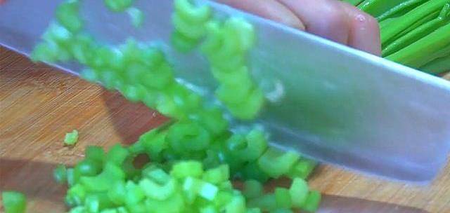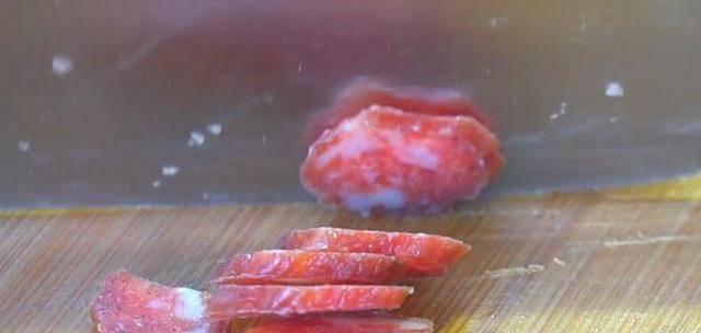 4.臘腸切成薄片備用。廣式臘腸,川式臘腸都可以。