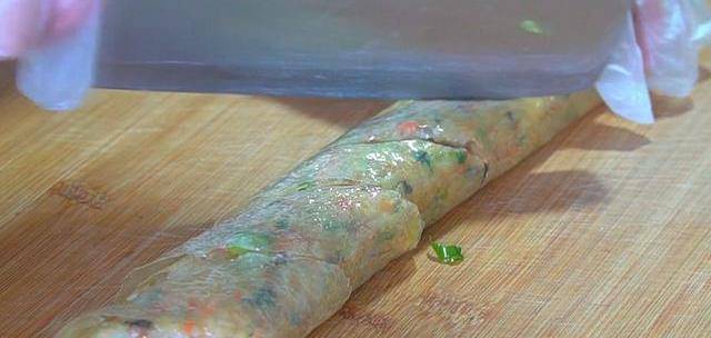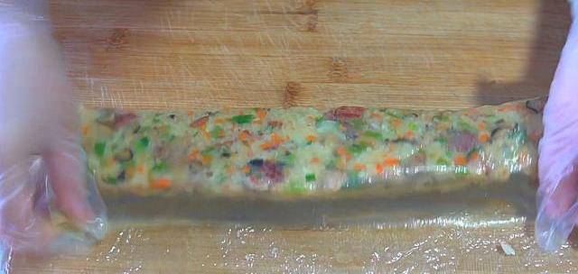 12.幹豆皮攤平,然後放入適量的餡料,左右預留一點,把糯米整理成圓柱型。