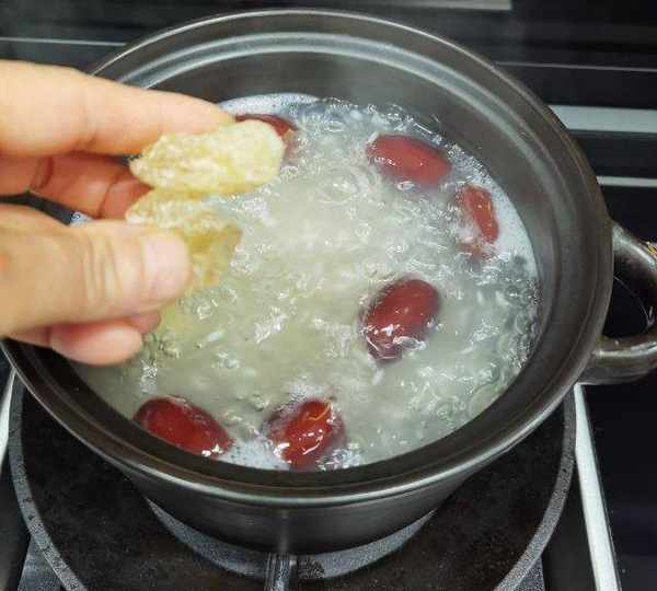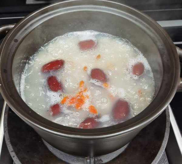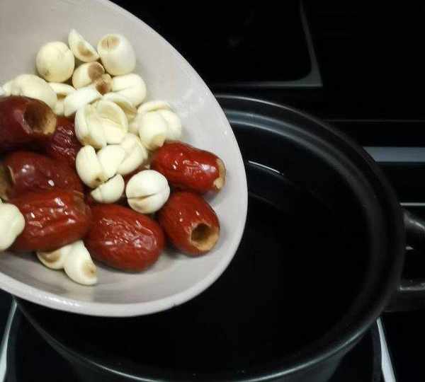 第6步、砂鍋加水,將紅棗和蓮子放進去大火煮開。