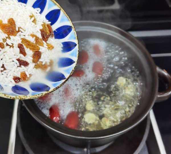 第7步、洗好的糯米和葡萄幹放進去大火煮開,轉中小火煮40分鐘。