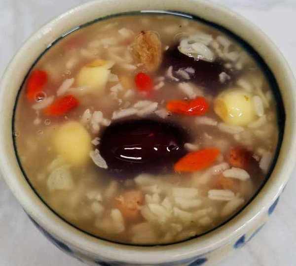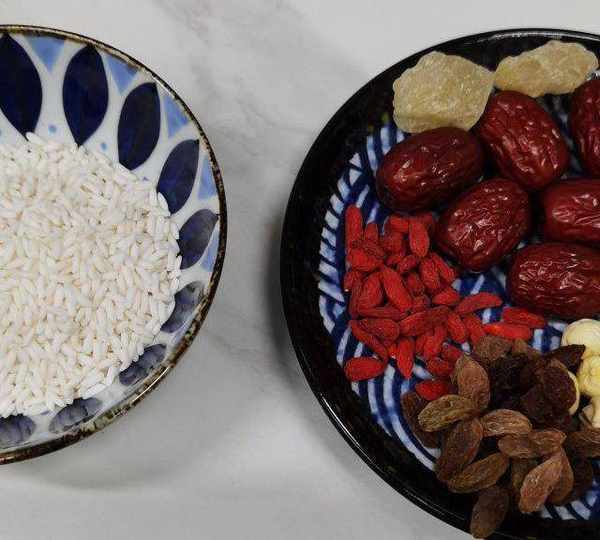 原料:糯米、紅棗、蓮子、葡萄幹、枸杞、清水、冰糖。