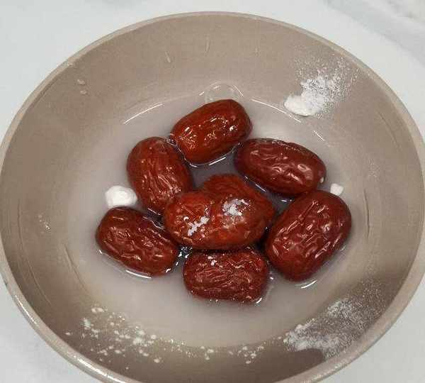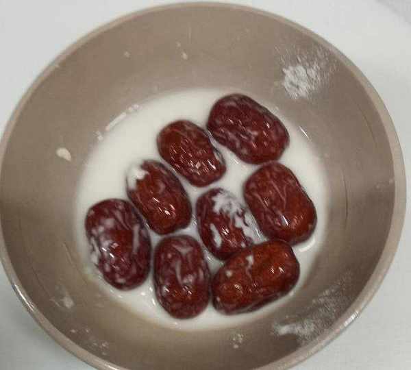 第2步、取一小碗。裡面加少許鹽和面粉,將紅棗放進去。