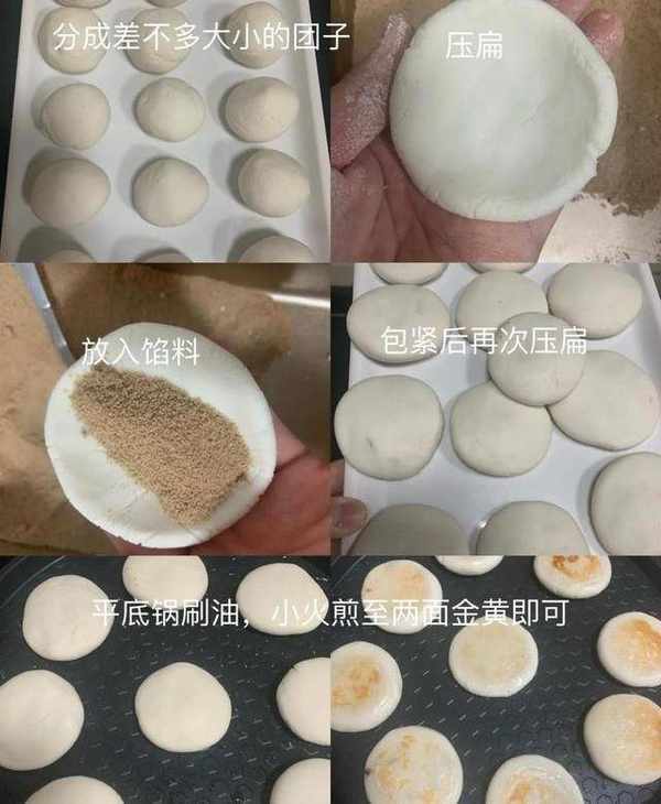 3、將糯米面團分成大小均勻的小面團,壓扁,包上紅糖餡,包緊,再次壓扁。
