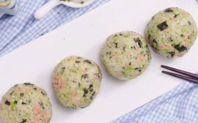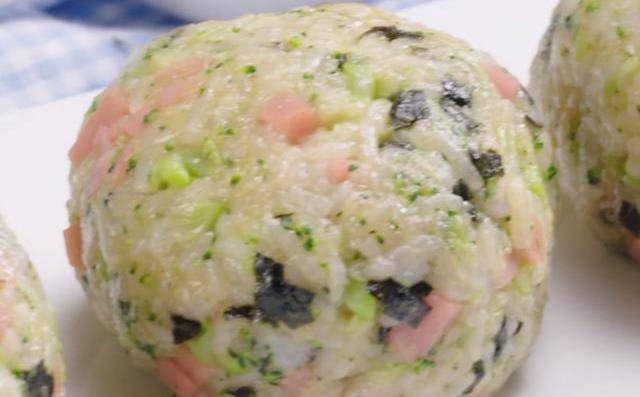 第三步:最後把處理好的火腿丁,西蘭花碎,海苔碎一並倒入鍋中,均勻攪拌一分鐘後,準備一張稍微厚一點的保鮮膜,用勺子舀適量的糯米飯鋪在保鮮膜中,然後把保鮮膜向中間收攏,攥成一個團狀,這樣今天這款糯米團子就完成瞭。當然瞭,戴上一次性手套處理這款美食也是非常不錯的選擇哦。