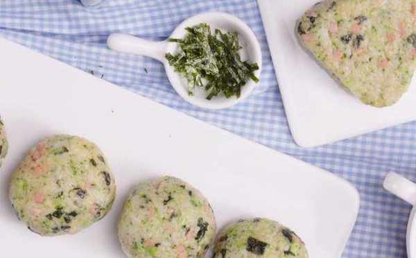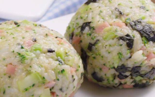 【準備原料】:預先煮熟的溫糯米飯300g,西蘭花120g,海苔碎40g,火腿方腸三分之一根,少許的食用油,一勺生抽,一勺耗油即可。