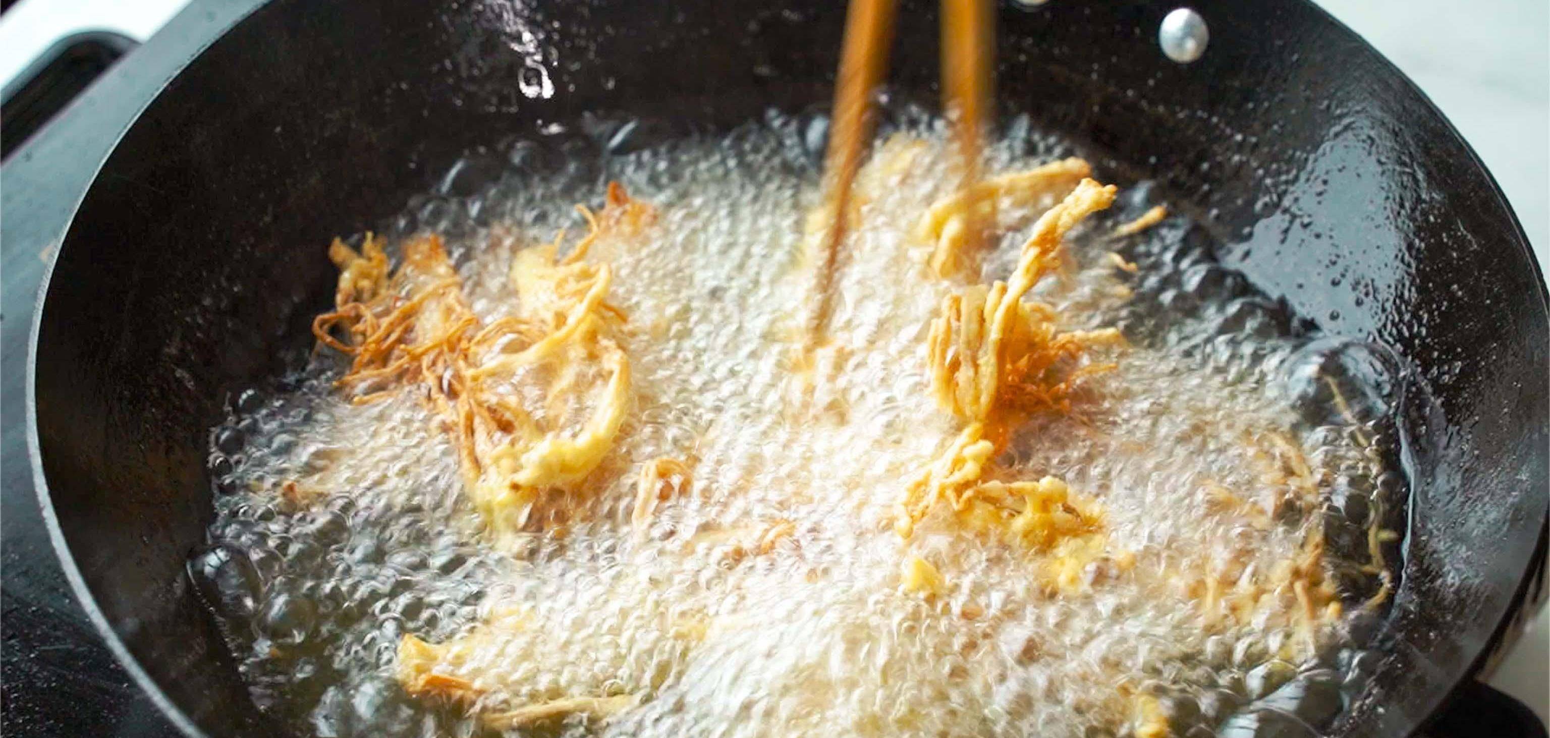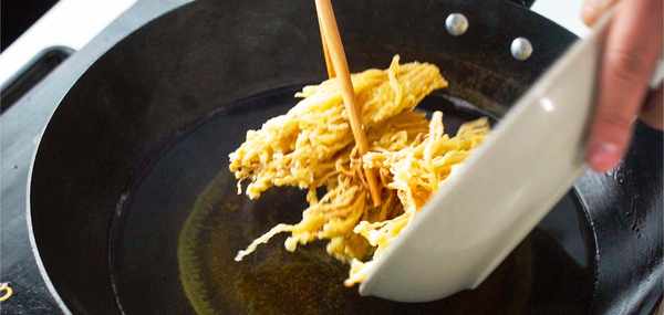 裹粉後的金針菇接下來就要油炸定型瞭,鍋裡倒入多一些的大豆油用火燒熱。油鍋下入竹筷子觀察,當氣泡冒出的多一些時油溫大約為5成熱。我們就可以把裹粉後的金針菇下入鍋中炸定型,定型後的金針菇用漏勺快速撈出來控油。