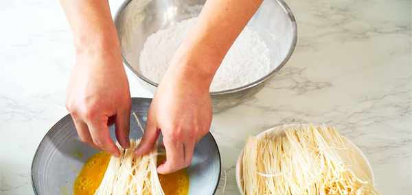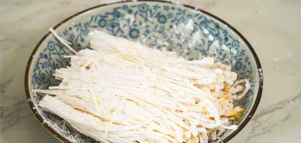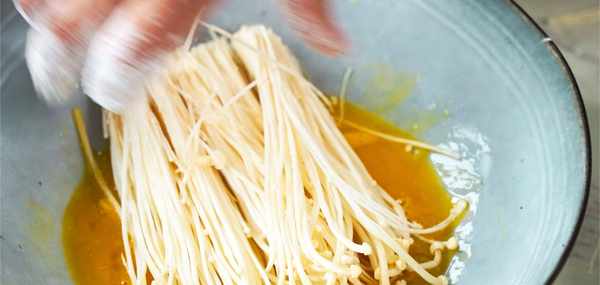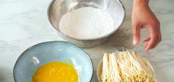 2.油炸金針菇前裹住雞蛋液和淀粉能讓炸出的金針菇保持金黃色且口感發酥,倘若直接油炸金針菇吃起來比較油膩味道會大打折扣。