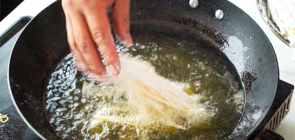 不用管鍋裡的油,讓其繼續加熱。等油溫升高後再次把炸定型的金針菇下入鍋中炸一遍,這第二次油炸是為瞭讓金針菇吃起來發酥。觀察金針菇炸至金黃色時就可以撈出瀝油瞭。雖然2次油炸後的金針菇已經熟瞭,但為瞭有酸甜的口感我們還需要調配一些酸甜醬汁。