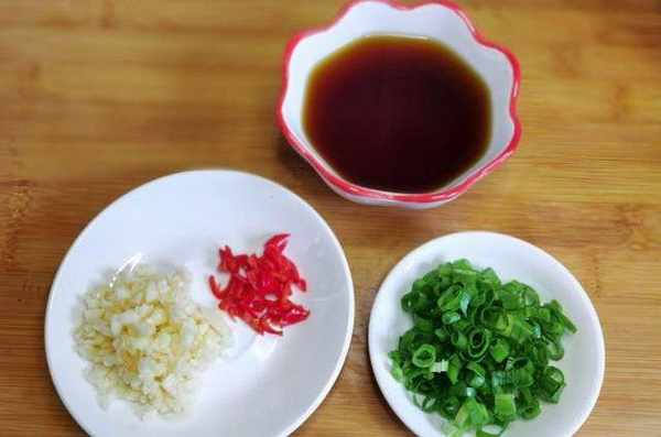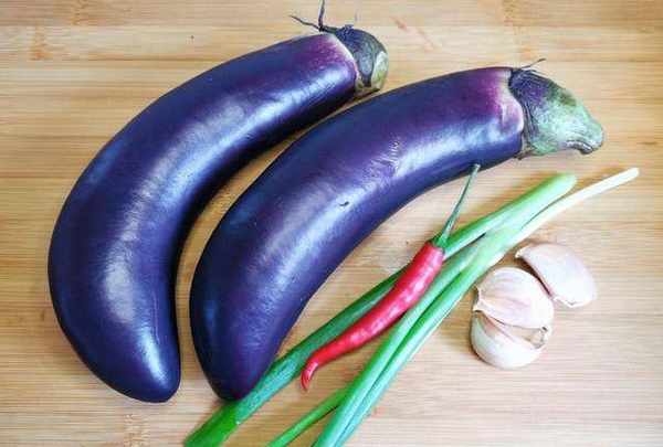 食材:長茄子2個、香蔥2根、大蒜3瓣、紅辣椒1個。